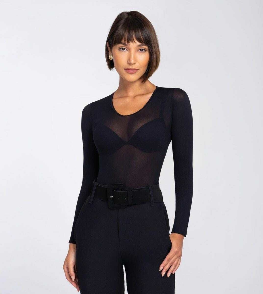 Blusa segunda pele sem gola preta. Com transparência e super estilosa, é uma ótima opção para os looks de inverno. Capriche no top ou sutiã e arrase como blusa principal ou por baixo de coletes ou jaquetas.