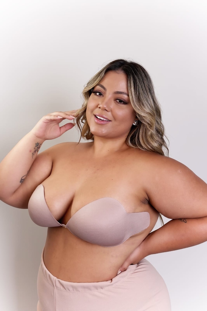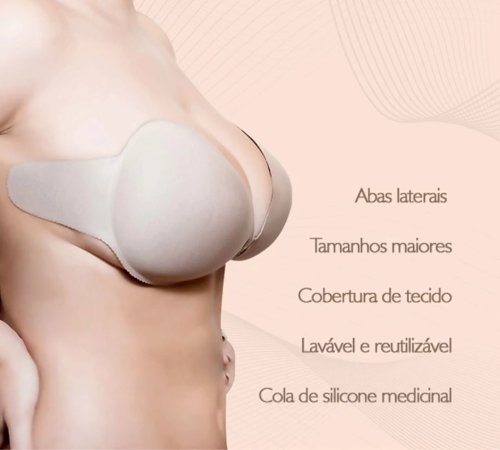 Sutiã adesivo com cobertura de tecido e cola de silicone medicinal na parte interna. Aba lateral para maior sustentação de seios volumosos.